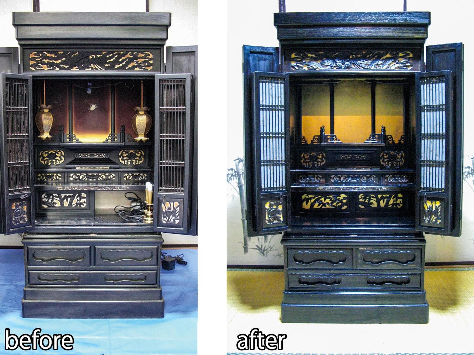1PP1N MALL -- サービス・他 -- 生活・サービス関連 -- ウエダジャパン ウエダジャパン ご先祖様より受け継いだ大切なお仏壇、傷んできたからどうしようかなと思っていませんか? 買い替えるよりも割安で蘇らせることが可能です。 仏壇はご先祖様のお家ですので、新仏様が入る49日前、法要前、リフォーム、新築などのタイミングでご利用される方が多いです。 仏壇紗(網戸)張替え1 枚 3,300 円~(税込) 仏壇金紙張替え一式 16,500 円~(税込) 仏像仏壇の大きさにより料金が異なります。見積り無料ですのでお気軽にお問い合わせください。 ■住所/昭和町西条 2601-1 ■TEL/055-275-8712■定休日/日曜日・祝日■営業時間/9:00 ~ 18:00